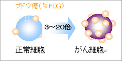 ほとんどのがん細胞は分裂増殖のため大量のエネルギーを要しており、正常細胞の数倍から20倍のブドウ糖を取り込みます。代謝されないブドウ糖類似物質にF-18で標識したものがFDGです。
