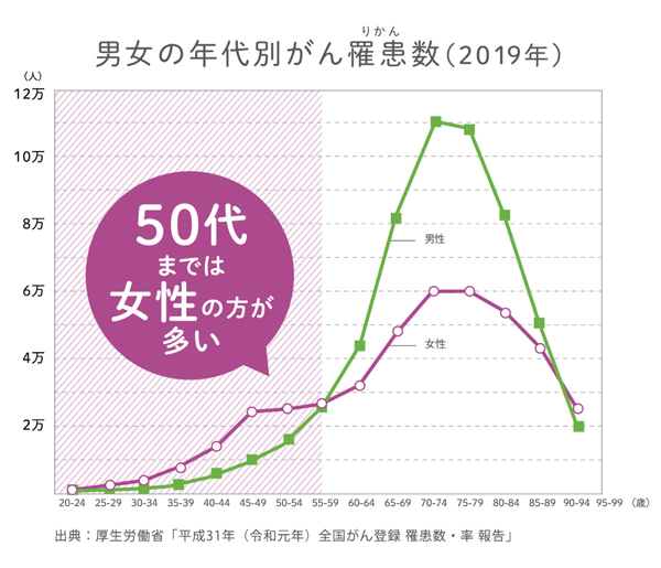 日本では、生涯でがんになる確率は男性が約62%、女性が約49%と非常に高く、特に50歳代以降に急激に増加します。