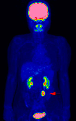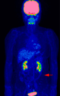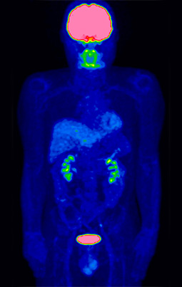 また、検査に使う薬(FDG)が集積する脳・腎臓・膀胱・尿管部位も、集まった薬で遮蔽されてがんかどうかの診断が難しくなります。