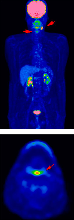 がんの拡がりを調べるのに用いられるのがCT検査やMRI検査、超音波検査、X線透視、内視鏡、核医学検査(アイソトープという放射性同位元素を使った検査)等の数々の診断法です。中でも核医学検査の一つであるFDG-PET検査は、1回の撮影(約20分)でほぼ全身の状態を画像にし、どこに潜んでいるかわからない転移巣の検索に高い効果があり、治療前の病期診断をすることが有効といわれています。