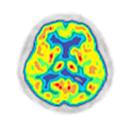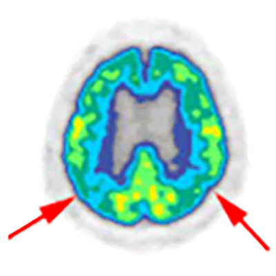 側頭頭頂葉連合野の代謝低下が見られます。ブドウ糖の取込の度合いが記憶や理解力に関係する部位で低下するのがこの病気の特徴です。